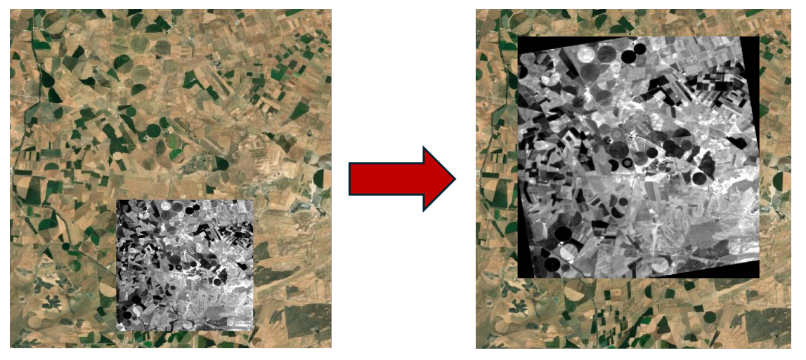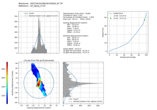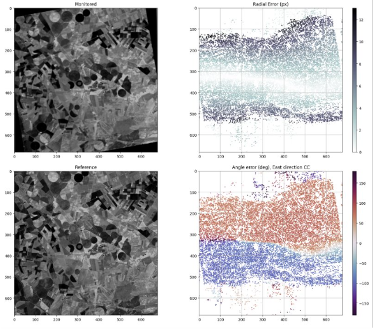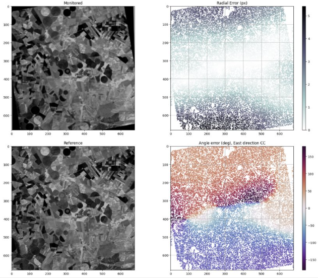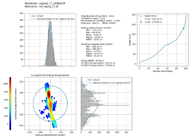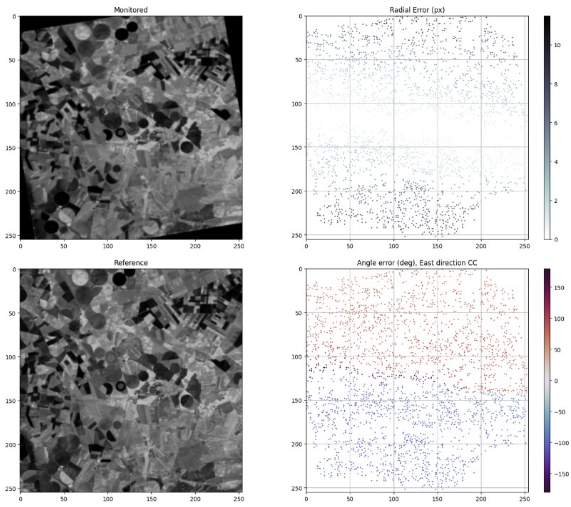 The results show that the matching has only been performed partially. The corners near the center are captured whereas the ones in the upper and lower part of the image are not detected as the difference is too high. Thus, the final result is not meaningful for the whole image, and the TPS correction should not applied as the process depends on the detected corners. A downsampling can be performed to allow better matching (bi-cubic). A resolution of 48m is a good compromise between matching and not lowering too much information.