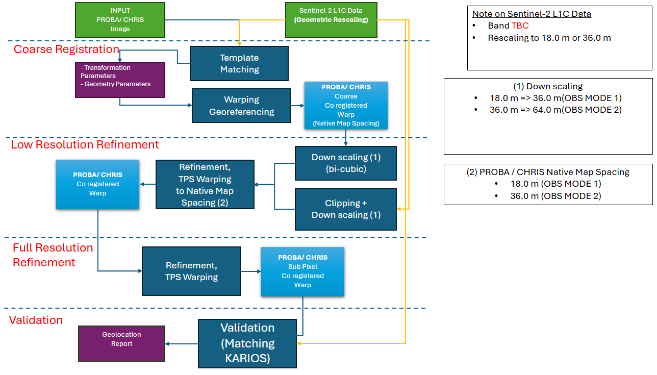 A template matching algorithm can be used, followed by a re-alignment and scaling process. With an ORB matching process, translation, scale and rotation values are estimated and applied to the CHRIS template. The result template will then we compared to a S2 reference with KARIOS.